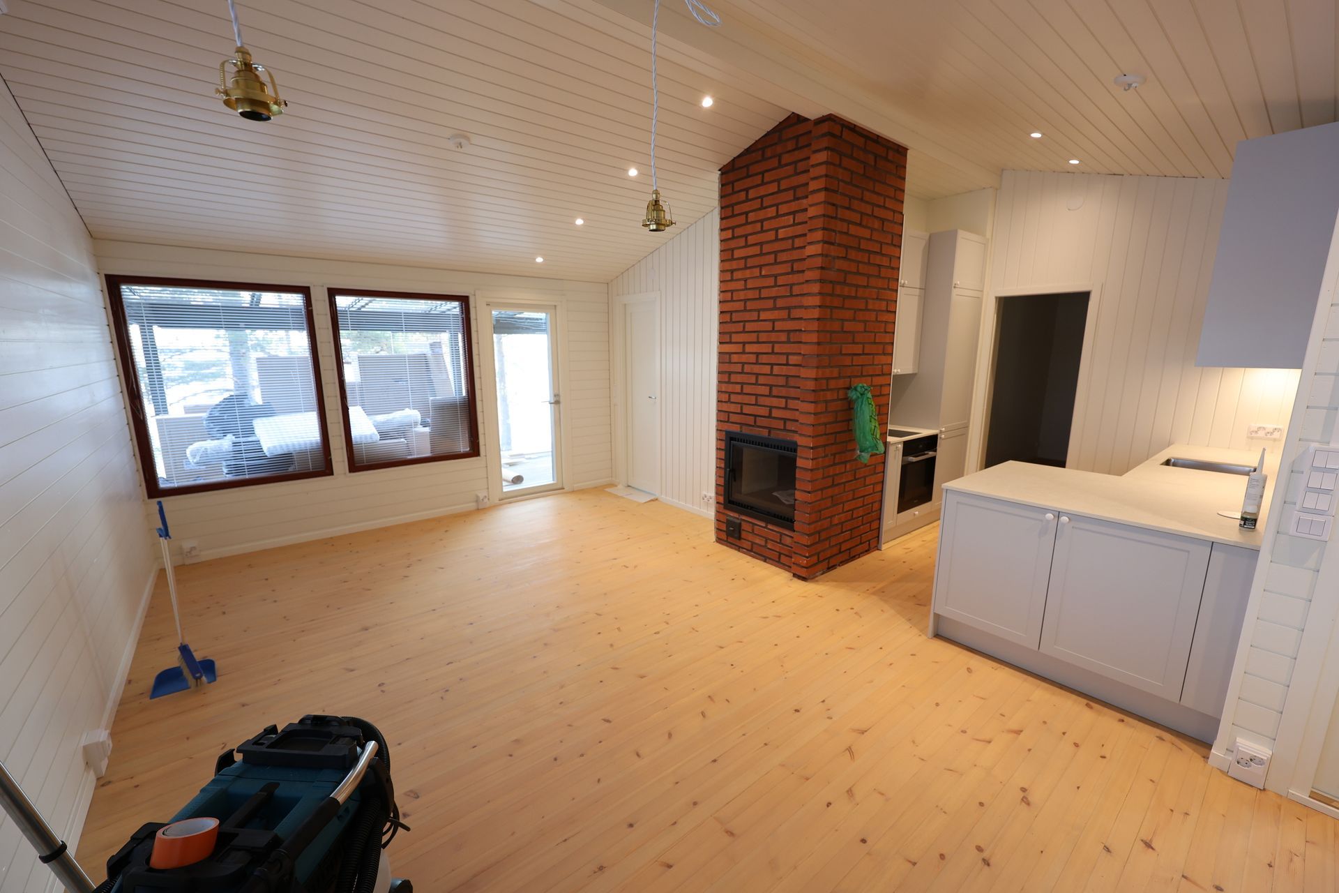 Olohuoneen ja keittiön muutos avonaisemmaksi.